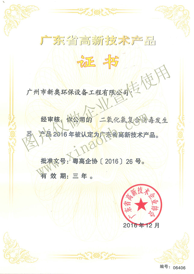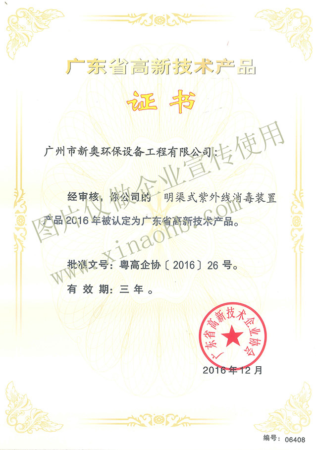 2016年12月,广州市新奥环保设备工程有限公司在全体员工的共同努力下,经过严格的层层审查,zui终喜获由广东省高新技术企业协会颁发的《广东省高新技术产品证书》,此次获得高新技术产品认定的产品有三个,分别是“明渠式紫外线消毒设备装置、过流式紫外线消毒设备和二氧化氯复合消毒发生器”。