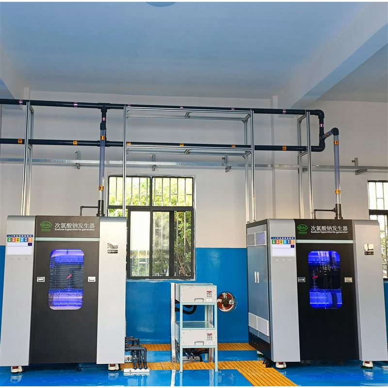 酸洗系统:电解槽在使用一段时间后,电极表面会结垢,需要定期用酸洗系统进行清洗,从而保证电极的电解效率和寿命,我司的酸洗系统设置为全自动清洗系统,可以设定清洗周期,定时清洗,保证设备的运行稳定;