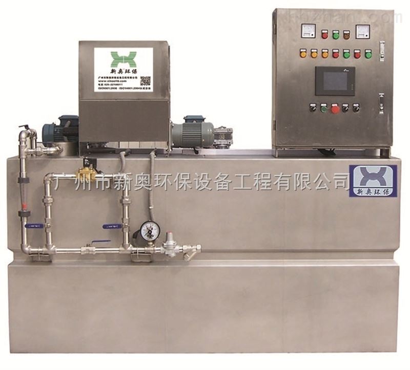 PAM干粉投加机由三腔式箱体、干粉投加系统、溶解系统、熟化系统、储药系统、控制系统、液体投加系统构成。本装置是粉状高分子凝絮剂的自动连续配置及投加系统。干粉絮凝剂从螺旋推进器内进入速溶器内与清水进行预混,被湿润的物料进入配制槽进行搅拌稀释,按要求浓度进行配制;若为液态絮凝剂则由螺杆泵直接投加到配制槽中。配制过程中,进水量在流量计观测下必须相对稳定,从而保证在整个工作过程中,配制溶液浓度不变。具有误差小,调节方便等优点。设备全采用PLC控制,设有手动、自动两种工作方式。